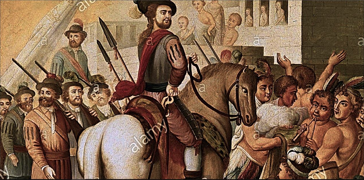 Previamente al dejar resguardado su caballo herido en el Petén, Hernán Cortés, había ordenado la ejecución de Cuauhtémoc, el último tlatoani del Anáhuac, dirigiéndose en esos momentos a los Hiuberas, a someter y castigar la insubordinación e infidencia de Cristóbal de Olid, quién tras emprender una expedición en busca del estrecho que comunicase las aguas oceánicas, se había compaginado con su enemigo, el gobernador de Cuba Diego Velázquez.
