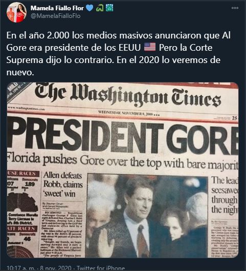 Cuando los contendientes George W. Bush del Partido Republicano, y Al Gore por el Demócrata entraron al final del túnel en la votación en la Florida, la Corte puso fin a un recuento, y Gore concedió la derrota públicamente reconociendo la legitimidad de la victoria de Bush diciendo: «Mientras estoy firmemente en desacuerdo con la decisión de la Corte», procedió a aceptar la derrota.