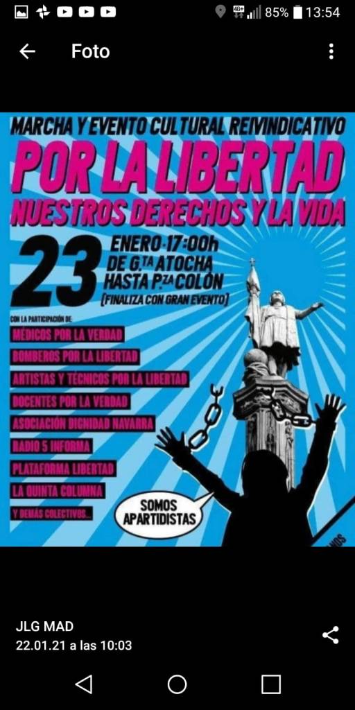 Hay una verdad oficialista que es la que se impone por tv y otra científica no oficialista que está intentando abrirse paso entre la maraña de medios de comunicación comprados por el gobierno. Este pasado sábado 23 de enero de 2021 miles de madrileños y personas venidas de otras provincias salieron a la calle en la que ha sido hasta ahora la manifestación con mayor número de convocantes contra las medidas y la gestión de la plandemia. Llevada a cabo en pleno centro de Madrid, saliendo desde la Glorieta de Atocha y finalizando en la Plaza de Colón, donde al término de la misma, se leyeron varios manifiestos.