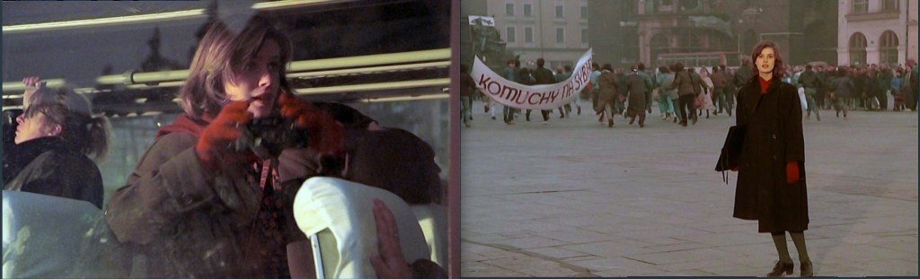 En un momento en medio de un conflicto social Weronika logra ver a su doble; solo ella se da cuenta, nota a la turista francesa en un camión que parte apresurado, tomando tantas fotos como puede de la llegada de la policía para reprimir la manifestación en una plaza que la primera ni siquiera mira. Se encuentran dos visiones del mismo hecho, dos visiones del mundo.