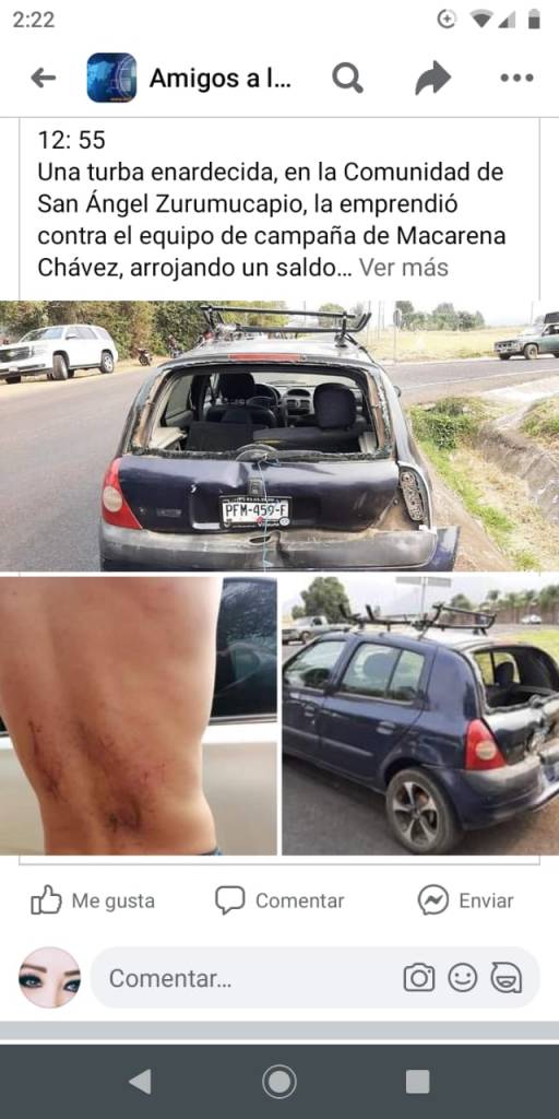 El equipo de campaña de Macarena Chávez, candidata de la coalición PAN-PRI-PRD a la diputación federal por el distrito 11 fue agredido violentamente esta mañana en la comunidad de San Ángel Zurumucapio.