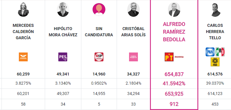 Con un total de 98 % de casillas con conteo finalizado en el IEM de Michoacán, el resultado dice que el 41.59 % de votos favorecen al candidato de MORENA y que el 39.03 % pertenecen al más cercano contendiente, el de la alianza PRI, PAN, PRD.