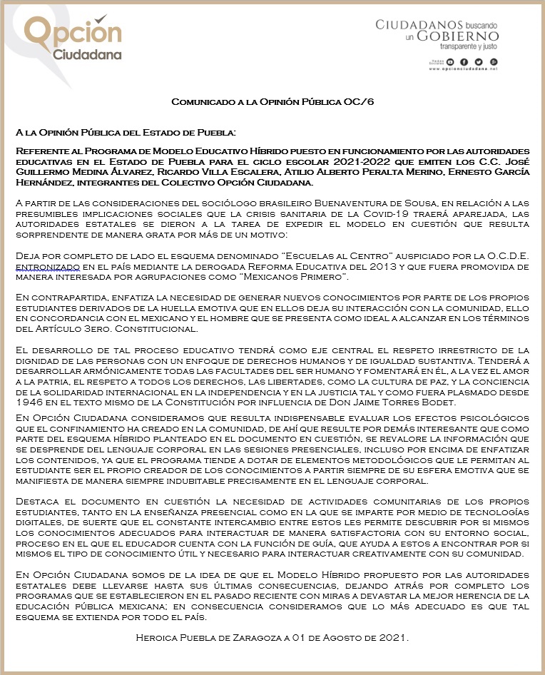 Referente al Programa de Modelo Educativo Híbrido puesto en funcionamiento por las autoridades educativas en el Estado de Puebla para el ciclo escolar 2021-2022 que emiten los C.C. José Guillermo Medina Álvarez, Ricardo Villa Escalera, Atilio Alberto Peralta Merino, Ernesto García Hernández, integrantes del Colectivo Opción Ciudadana.