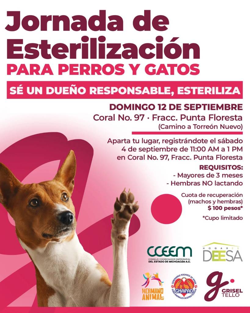 El Consejo Coordinador Empresarial (CCE), organización civil que aglutina a las mujeres y hombres de negocio del Estado de Michoacán quienes a través de su liderazgo implementan prácticas transformadoras, se unen al trabajo de la Lic. Grisel Tello, esposa del Gobernador Electo Alfredo Ramírez Bedolla, en esta ocasión con la Tercera Jornada de Esterilización a bajo costo, de calidad y masiva, a llevarse a cabo el próximo domingo 12 de septiembre en el Fraccionamiento Punta Floresta, desarrollo habitacional ubicado la zona de Torreón Nuevo en Morelia.