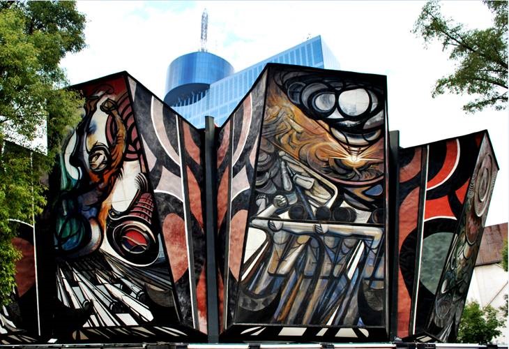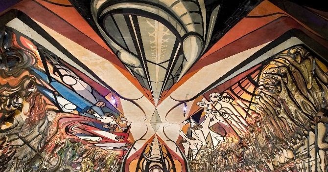 Los muralistas exacerbaron ese ímpetu y lo plasmaron a gran escala, tan grande como su protesta, tan absorbente como su realidad, tan inmenso como la debacle que avistaban para la nación que veían desmoronarse frente a sus ojos. David Alfaro Siqueiros quiso pintar el más grande de todos los murales que la humanidad jamás haya siquiera sospechado pintar, quiso también conjugar dos formas de arte, la pintura y la arquitectura y construyó y pintó el Polyforum hoy con su nombre. Mamparas altísimas y circundantes revisten la fachada y un mural envolvente que sustituye a las bóvedas de los santuarios se posa a la cabeza del espectador en el interior. La han llamado “La Capilla Sixtina Mexicana” y no se han equivocado al bautizarla así pues resulta aún más grande que la emblemática construcción romana.