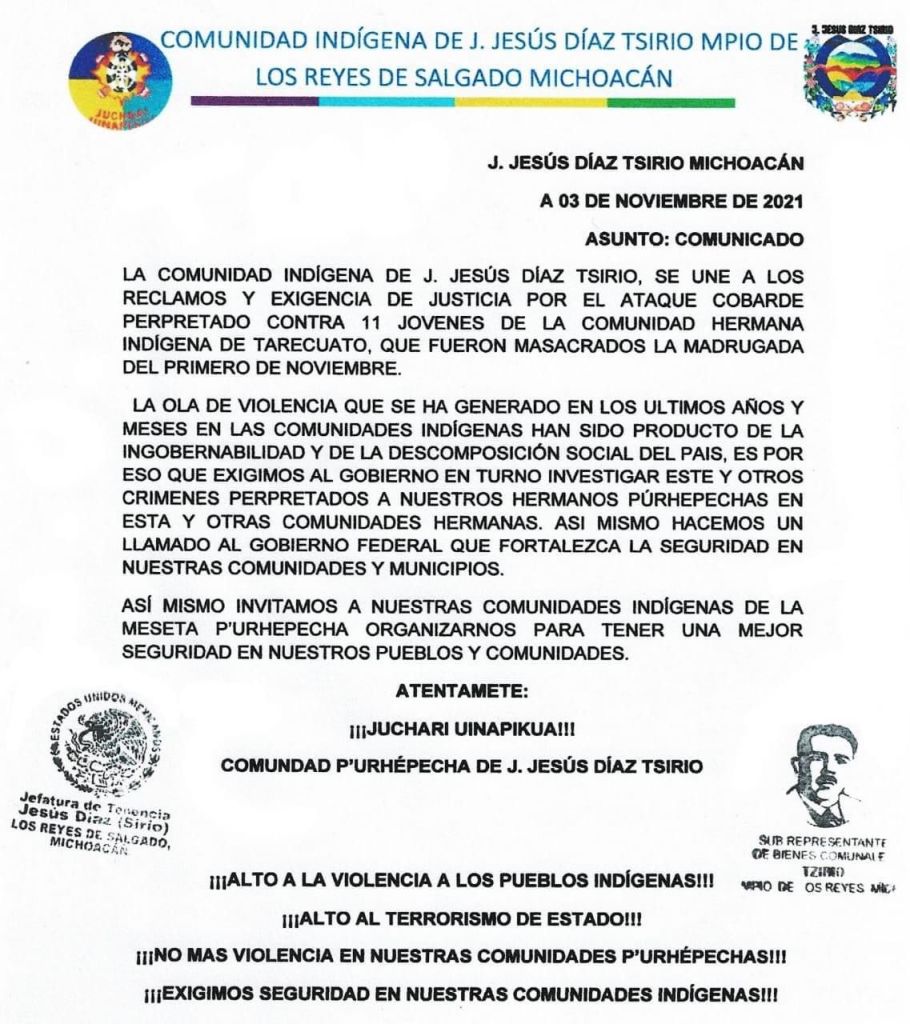Comunicado de la comunidad J. Jesús Díaz Tsirio