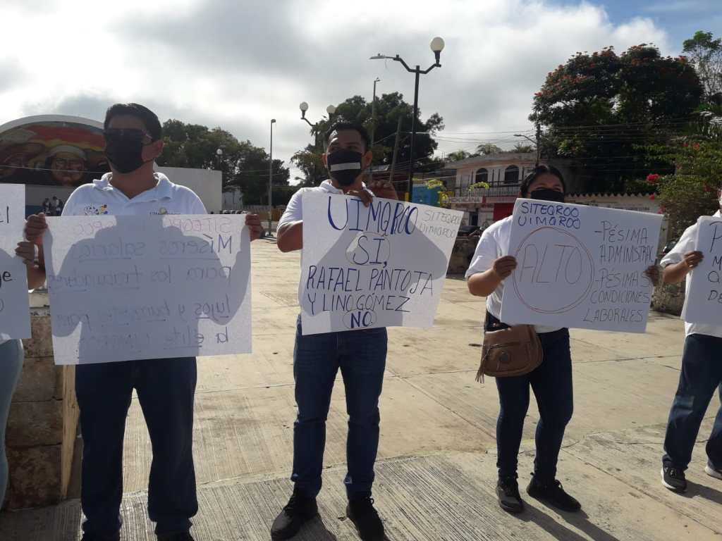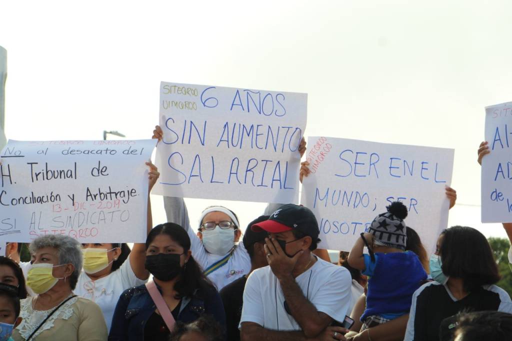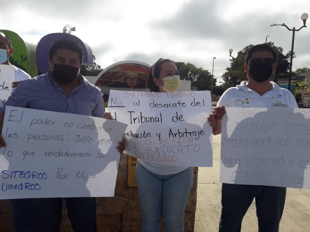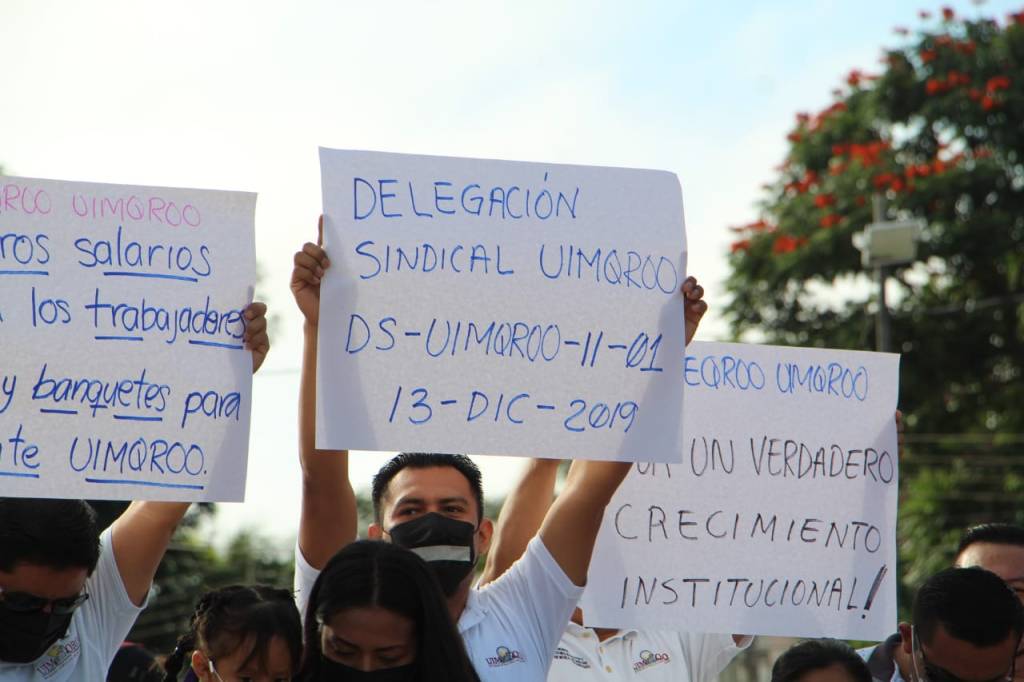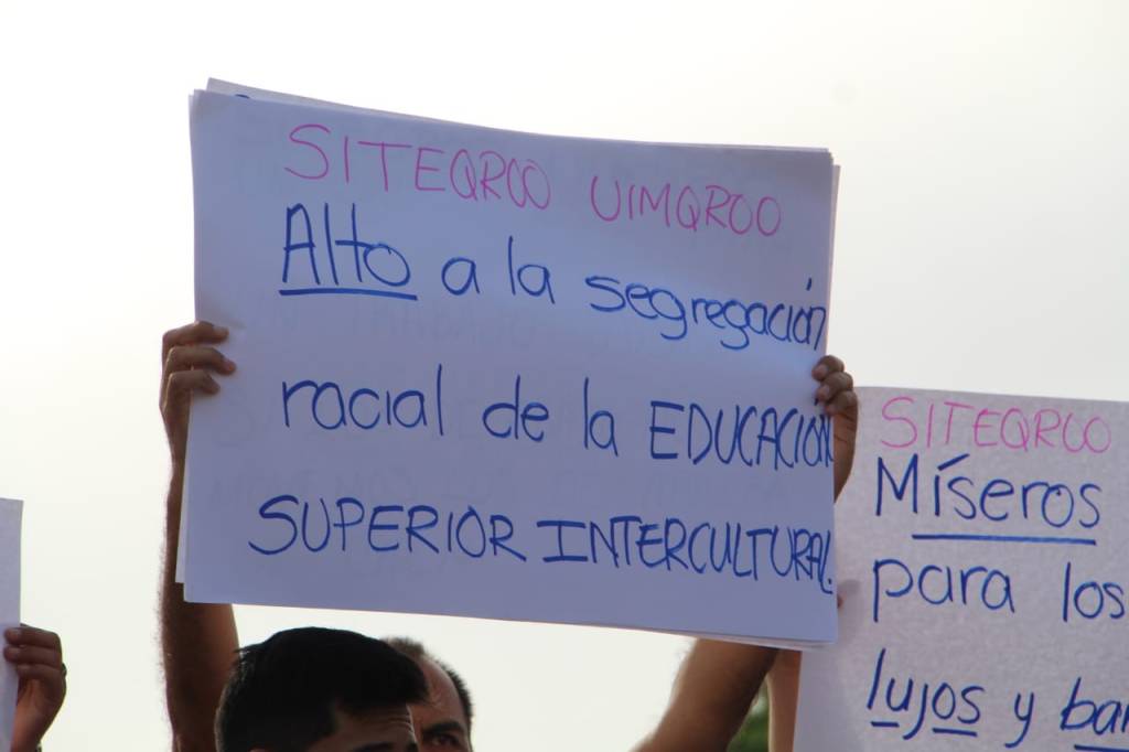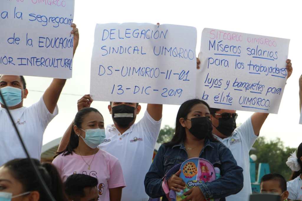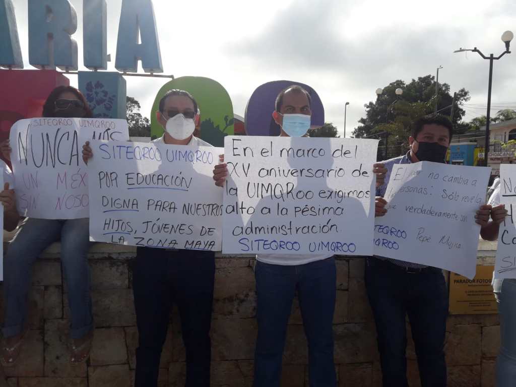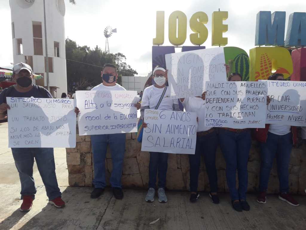 Seis años sin aumento salarial. Alto a la segregación racial de la educación superior intercultural. Alto a la pésima administración / Alto a las pésimas condiciones laborales. Uimqroo sí / Rafael Pantoja y Lino Gómez no. Estas son parte de las leyendas escritas en pancartas por integrantes del Sindicato Independiente de Trabajadores de la Educación del estado de Quintana Roo (Siteqroo), delegación Uimqroo.
