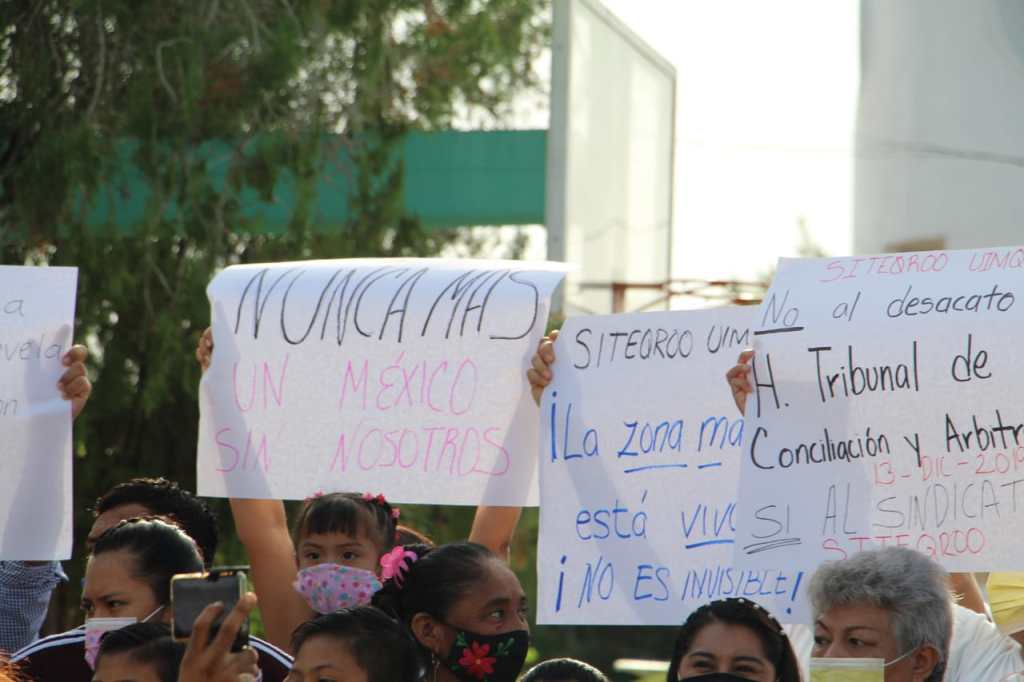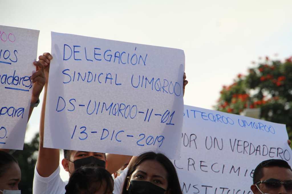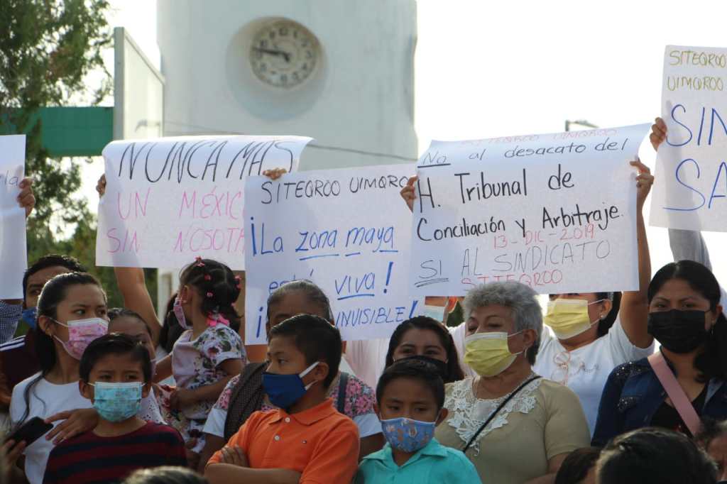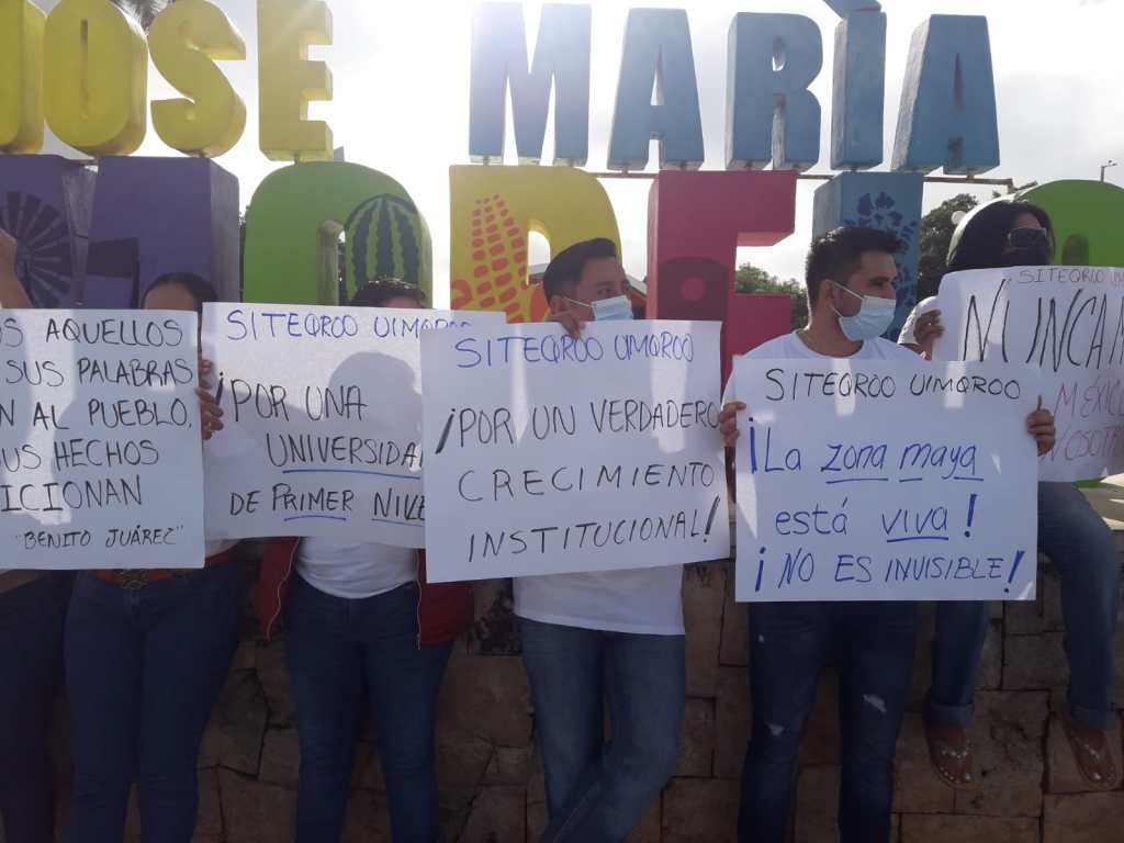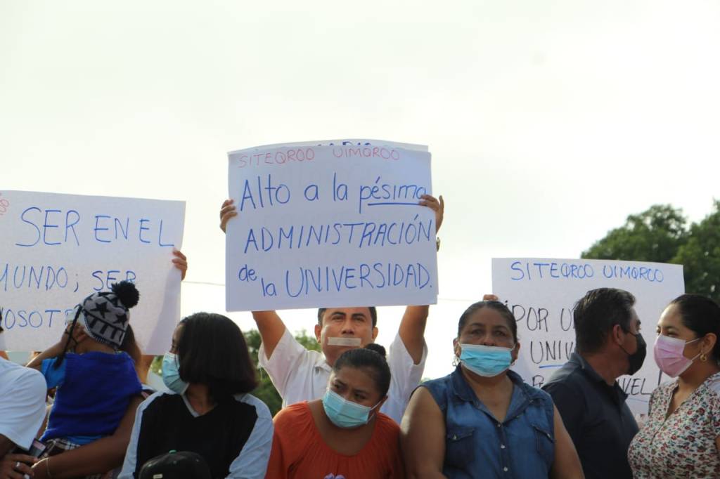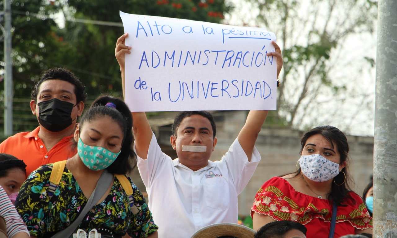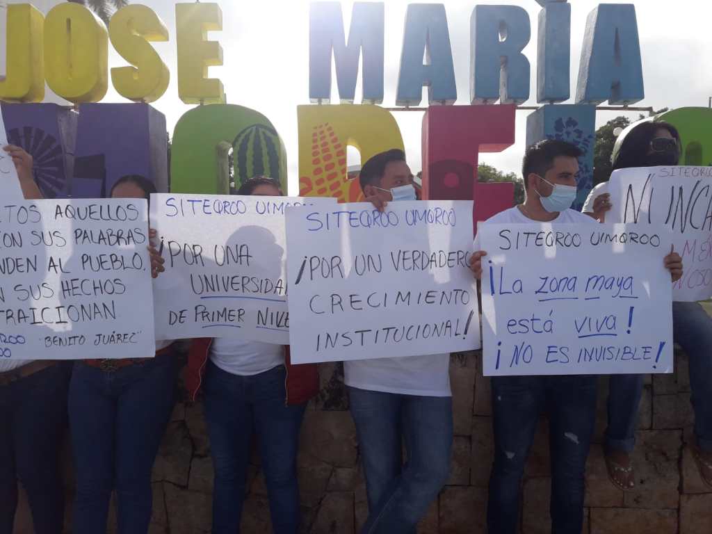Seis años sin aumento salarial. Alto a la segregación racial de la educación superior intercultural. Alto a la pésima administración / Alto a las pésimas condiciones laborales. Uimqroo sí / Rafael Pantoja y Lino Gómez no. Estas son parte de las leyendas escritas en pancartas por integrantes del Sindicato Independiente de Trabajadores de la Educación del estado de Quintana Roo (Siteqroo), delegación Uimqroo.