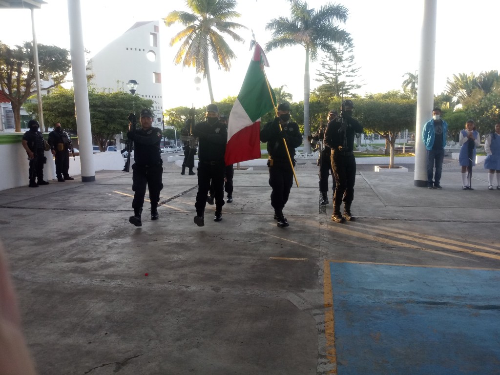 La policía municipal apareció con el lábaro patrio y tomaron posiciones. Más tarde, marcharon marcialmente a lo largo de la explanada, desplegando el símbolo patrio.