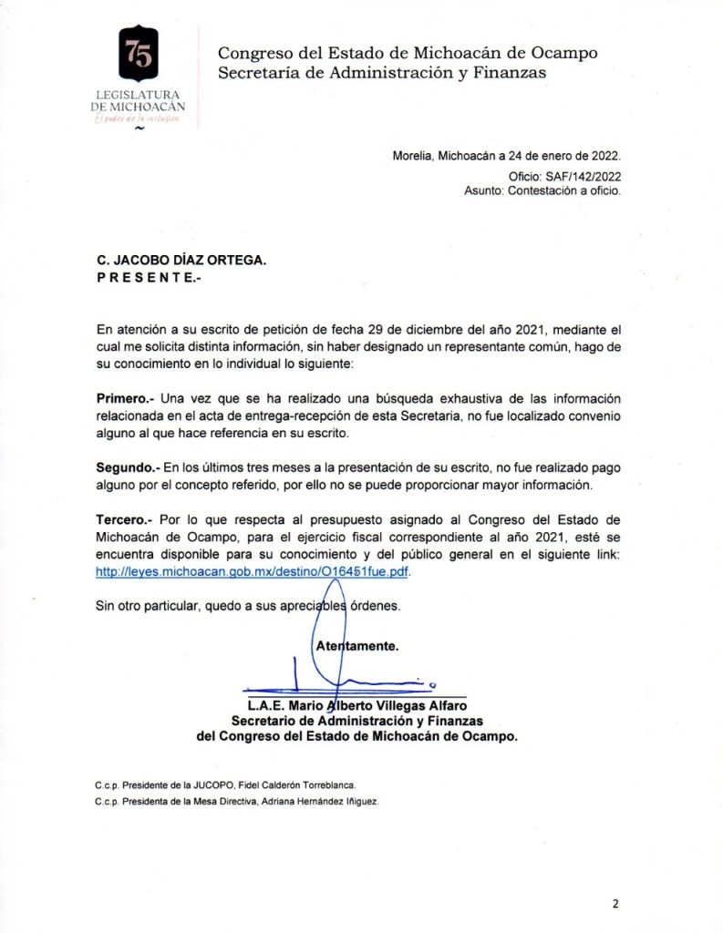 A lo largo de casi todo el mes de enero los ex trabajadores demandaron respuesta a su petición y el argumento fue siempre que el titular de Finanzas no lo había firmado. Sin embargo, en el oficio de respuesta del 13 de enero ya aparece la rúbrica de Villegas Alfaro, no obstante que fue recibido en la Coordinación de Transparencia el 6 de enero, ocho días después que el primero, es decir, lo pudo firmar casi de inmediato, en tanto que el de Administración y Finanzas de donde es titular lo firmó hasta el 24 de enero, pese a que lo recibió desde el 29 de diciembre.