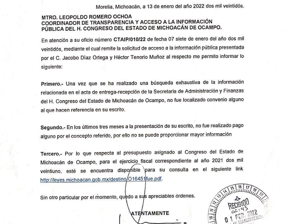 Al dar respuesta por escrito a la petición de un grupo de ex trabajadores del congreso local para que les entreguen copias de sus convenios individuales, tanto la Secretaría de Administración y Finanzas, como la coordinación de Transparencia y Acceso a la información Pública de la misma institución, aparte de mentir dolosamente al negar ambas instancias que tales acuerdos existan, incurren en diversos desatinos e incoherencias, porque la primera respuesta, solicitada desde el 29 de diciembre del año pasado, está fechada el 24 de enero y la segunda el 13 del mismo mes, pero firmadas ambas por el titular del área administrativa de la Cámara de Diputados, Mario Alberto Villegas Alfaro, y contestadas exactamente en los mismos términos.