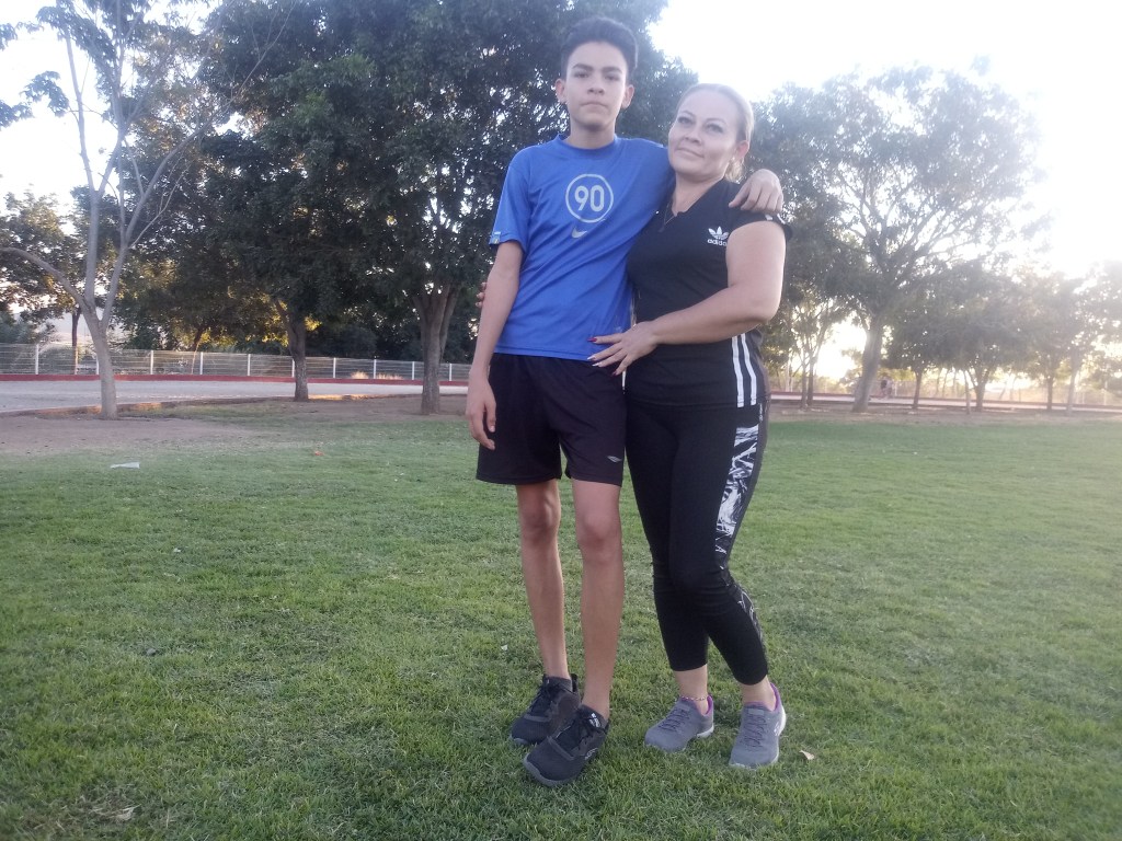 A su lado está Óscar Chávez García de 15 años. Él consiguió un segundo lugar en los 300 metros y cuarto lugar en los 150 metros. «En los 300 metros no aprete en la curva y me faltó velocidad, el que se llevó el primer lugar tenía más zancada». Se definió como un corredor de resistencia y declaró que apenas lleva dos meses entrenando, aunque a veces no puede ir a los entrenamientos. «Es un hobby y no me veo dedicándome al atletismo de manera profesional». Luego posó al lado de su orgullosa mamá Maricela García.