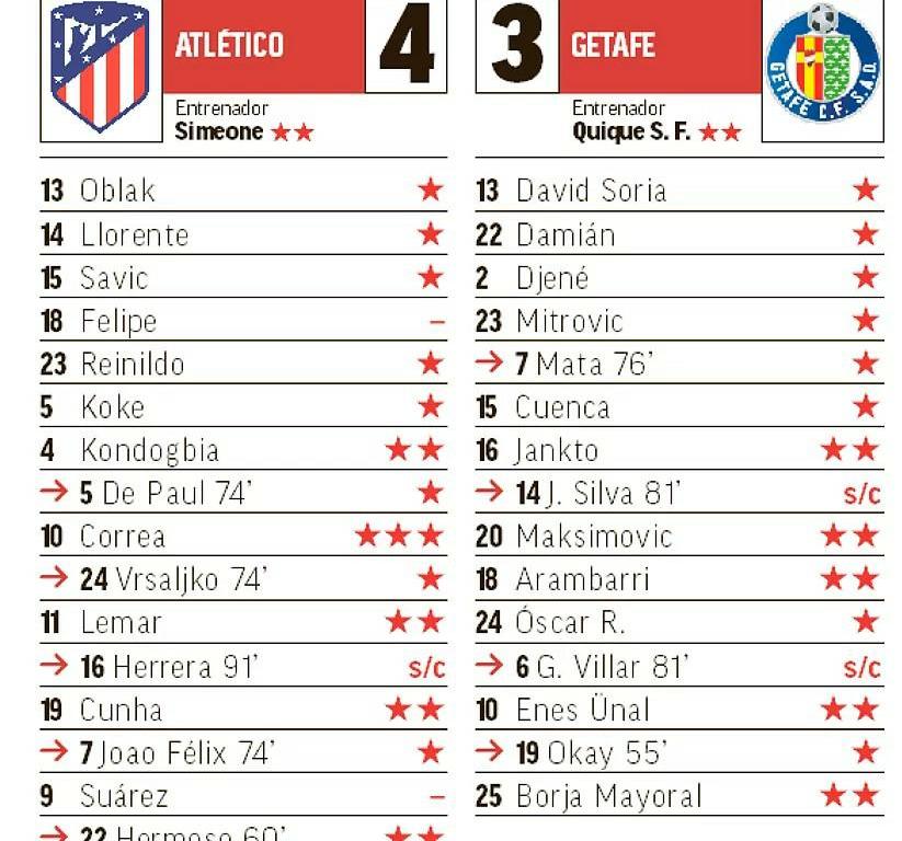 Atlético Madrid – Getafe , una historia de fútbol dramático y emocionante de vértigos: dos cero, dos tres y cuatro tres, la segunda parte con diez jugadores por expulsión del mexicano Felipe y gol del triunfo de Hermoso.