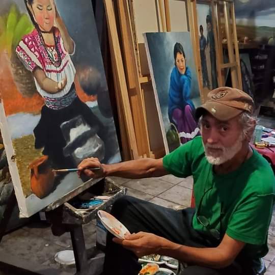 El oriundo de Tumbiscatío es autodidacta, y aprendió sobre el paso. Su infancia y adolescencia transcurrió en Uruapan, donde se vinculó a la pintura. “Desde que recuerdo siempre he estado al lado de los pinceles, en la primaria en Uruapan, después de clases iba a uno de las escuelas que fundó el ilustre pintor Manuel Pérez Coronado, Mapeco. Ahí lavando pinceles, aprendiendo de los muchachos más grandes empieza a gustarte. Después de esos, en la secundaria había una tecnología de la pintura, ¡hágame favor! Ahí le seguí con los estudios”. Recuerda que en el internado de Chapingo existía un club de pintura, “ni tardo ni perezoso me inscribí, asistía los sábados y domingos, con tan buena suerte que el maestro Javier era egresado de la Esmeralda la cual sigue vigente como escuela de Bellas Artes, sobre todo en pintura. El maestro Javier consideraba que me había equivocado de carrera y llegó a decirme que no era ingeniero agrónomo, sino pintor, sus palabras fueron proféticas. Quise estudiar la carrera de pintura de artes visuales pero no se podía llevar las dos cosas. Ya ejercí un rato la agronomía pero volví a mis cauces. Creo que aquí muero con la pintura”, sentencia.
