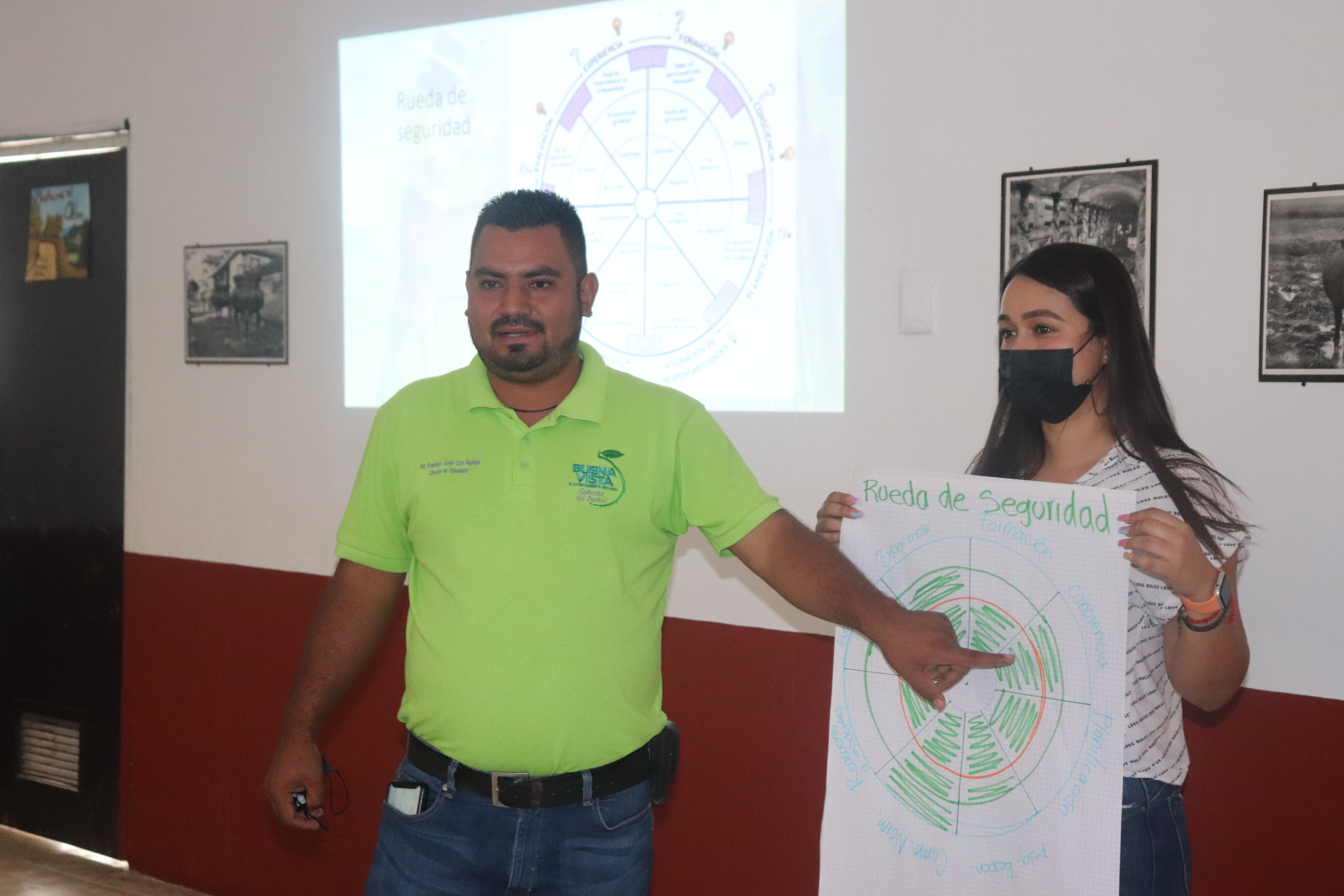 Los participantes del taller educativo conformaron varios equipos de trabajo que dibujaron una rueda de seguridad compuesta por ocho elementos: La formación, la conciencia, la planeación con perspectiva, la asignación de responsabilidades, el cumplimiento de normas, la reacción ante posibles incidentes, la evaluación y la experiencia.