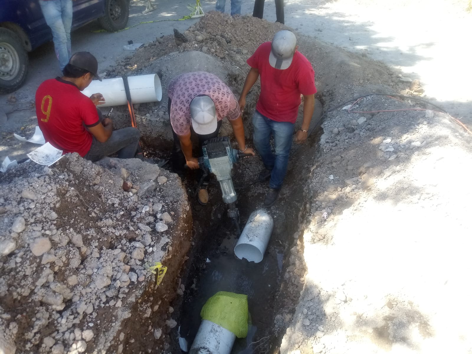 Explicaron que el problema con la reparación de la tubería hidráulica consistía en que no embonaba el pedazo de tubo. Fue necesario el uso del rotomartillo industrial para romper el piso firme, sin embargo, resultó insuficiente. Entonces se escarbó con una pala delgada; el cincel y el martillo se hicieron presentes. Incluso con las manos sacaron la tierra con tal de arreglar el desperfecto.