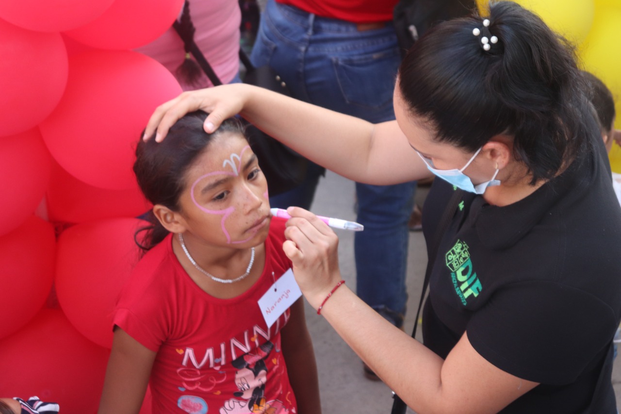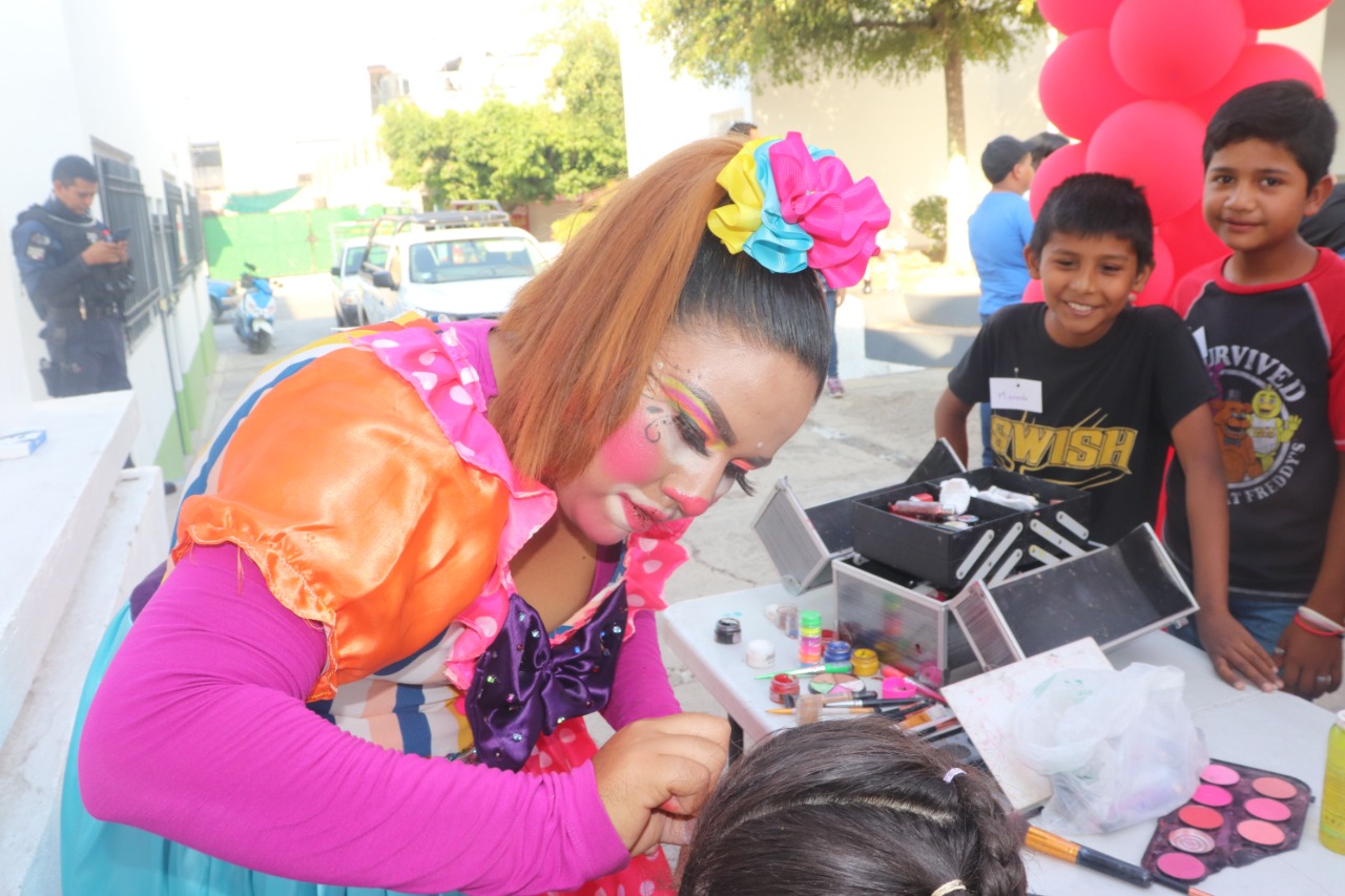 Mientras que en la fachada principal de la presidencia municipal, había enormes filas, sobre todo en el arco rojo hecho con globos. Ahí no se dio abasto la payasita de nombre Lupita Corona, quien dibujó figuras en el rostro de todo aquel que quiso. A un lado, en el arco amarillo, se repartieron paletas para aminorar el calor.