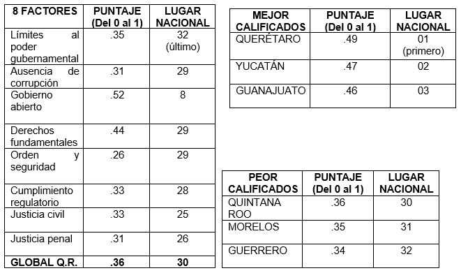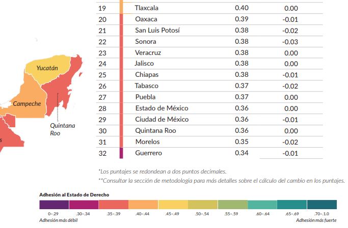 Quintana Roo ocupa el lugar 30 de las 32 entidades del país, de acuerdo al “Índice de Estado de Derecho” subnacional que publica cada año el World Justice Project (2021-2022), cuya metodología es la que se ha desarrollado para el “Índice de Estado de Derecho Global” entre países.