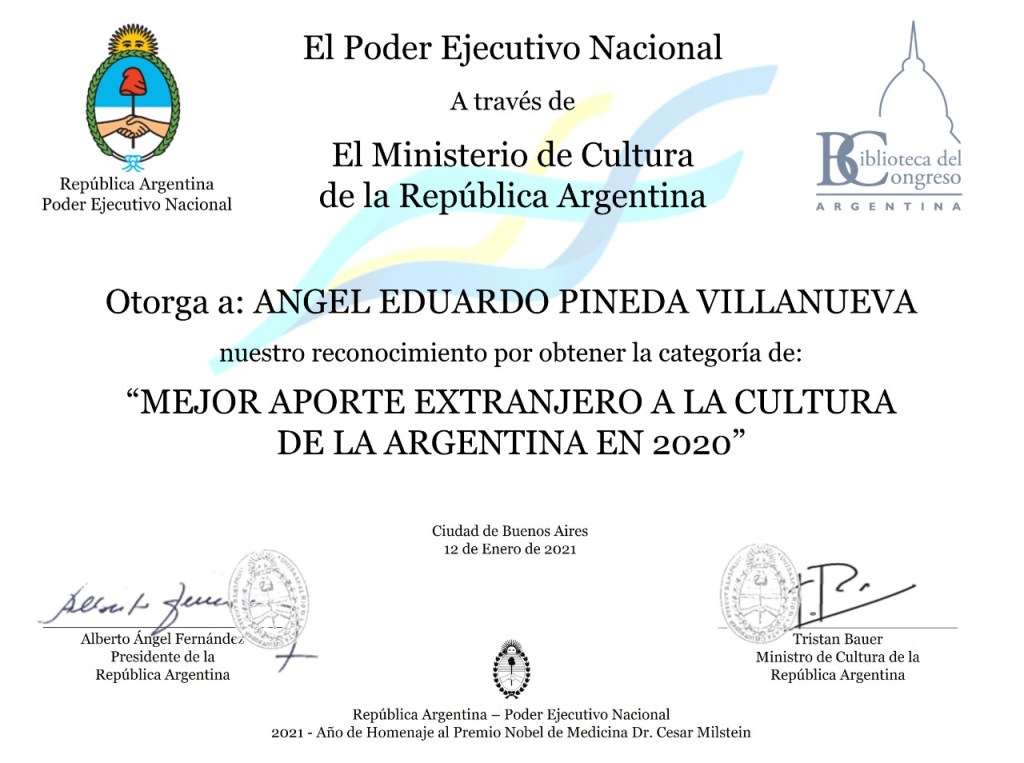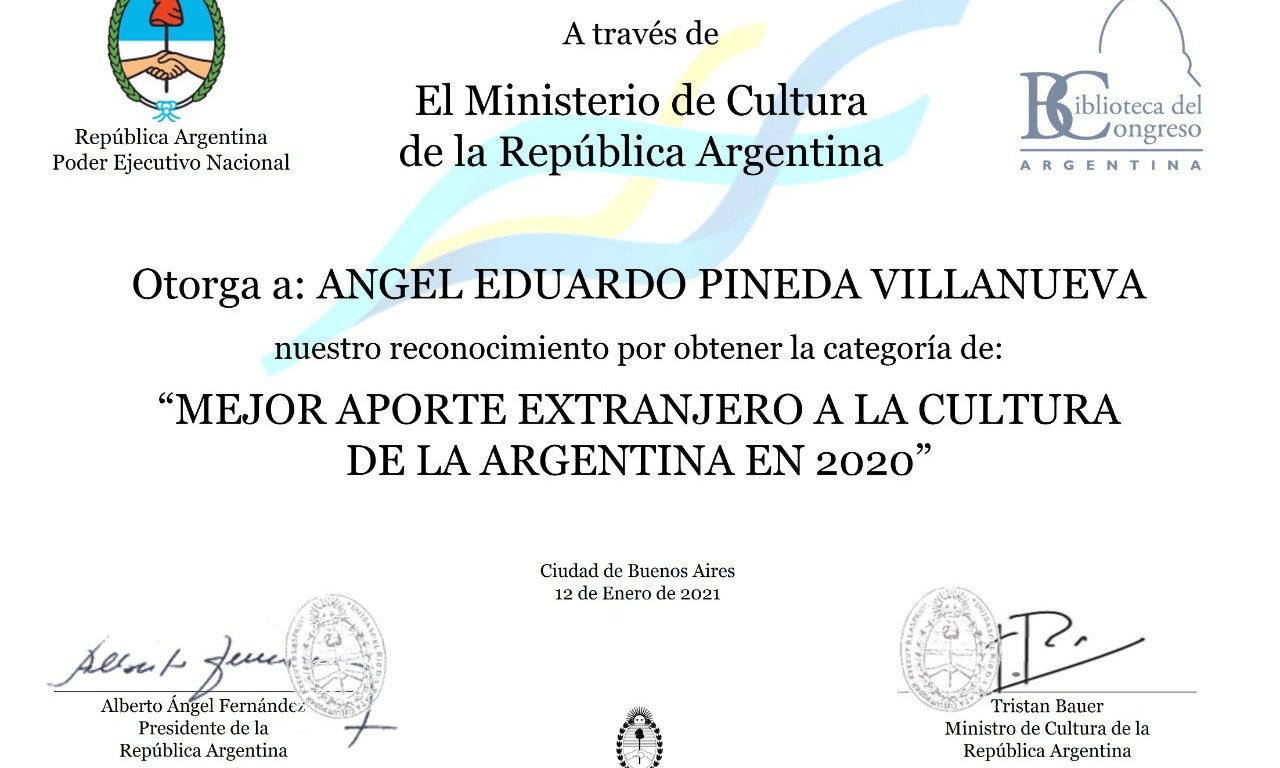 Eduardo Pineda, colaborador de la Revista Unidad Parlamentaria fué reconocido por el gobierno de Argentina como escritor y el aporte que ha tenido su obra en ese país.