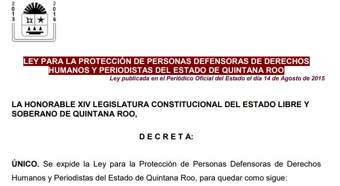 Desde 2011 diversas asociaciones de periodistas empezaron a impulsar el establecimiento en Quintana Roo del Mecanismo para la Defensa de Personas Defensoras de Derechos Humanos y Periodistas, cosa que se logró después de mucho esfuerzo, el 3 de agosto de 2015.
