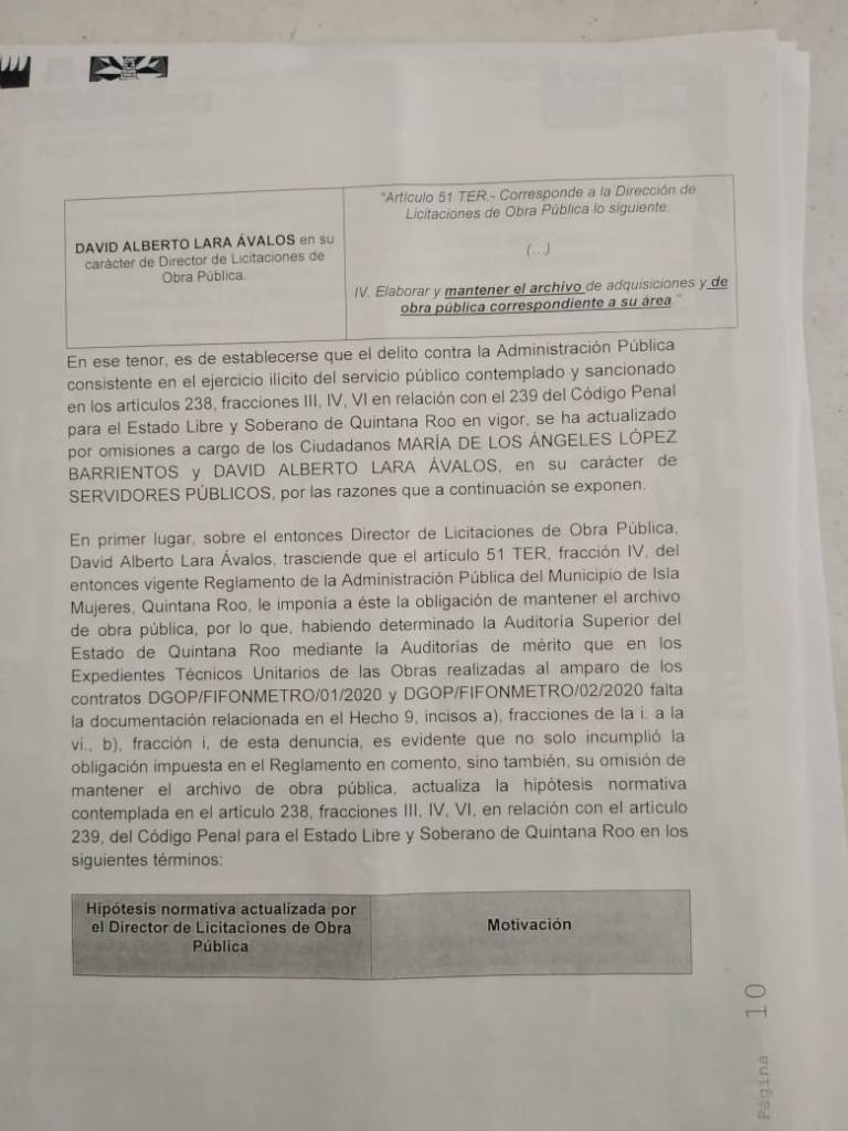 El par no pudo solventar las anomalías por más de 55 millones de pesos en el servicio público municipal en Isla Mujeres cuando María de los Ángeles López Barrientos era directora general de Obras Públicas y David Alberto Lara Avalos director de Licitación de Obras Públicas. Situación conocida gracias a una auditoría de la instancia Auditoría Superior del Estado de Quintana Roo (Aseqroo) a dos contratos, en el que los expedientes técnicos unitarios no están integrados de acuerdo a la normatividad, del alumbrado público en el Ramal Norte con recursos provenientes del Fondo Metropolitano por un monto 26 millones 987 mil 686 pesos y otro más por la construcción de calles en la Zona Continental de isla Mujeres (tercera etapa) por 28 millones 293 mil 42 pesos. Respecto a lo anterior, en su momento, la Aseqroo emitió un reporte de 12 resultados finales de auditoría y observaciones preliminares del ejercicio fiscal 2020 de la cuenta pública, donde se determinan seis observaciones con presunto daño patrimonial y 29 observaciones de cumplimiento legal, de las cuales se solicitaron justificaciones y aclaraciones pertinentes, que no fueron solventados por el ente fiscalizable en Isla Mujeres.