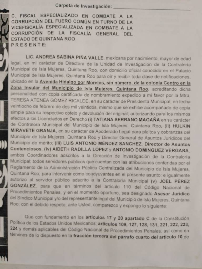 La documentación faltante, en el expediente técnico unitario de esta obra, es entre otras: estudios, proyecto arquitectónico e ingeniería de una obra, el catálogo de conceptos y especificaciones de construcción, como el caso de la construcción de calles en la etapa 3 y programa de ejecución que infringe las leyes en varios fracciones de la Ley de Obras Públicas y Servicios relacionados con las mismas del estado. También Incluso el documento describe la falta de manifestación escrita de conocer el sitio de los trabajos; el programa de utilización de personal técnico, administrativos y de servicios encargados de la dirección, supervisión y administración de los trabajaos, comprobante de cobro anticipo, póliza de cheques o transferencia interbancaria y todavía más, la inconsistencia en la bases para la licitación, ya que no se integra la constancia de registro formulada por la administración general de auditoría fiscal, no demostrados el capital mínimo requerido, no se integraron las cotizaciones de los insumos que se utilizaron en los conceptos de ejecución de obras. Sin embargo, los exfuncionarios isleños López Barrientos y Lara Avalos hoy están ahora en la administración pública municipal de Puerto Morelos que preside Blanca Merari (2021-2024). Todo lo narrado con anterioridad está atestiguado en un reporte final y en tres actas levantadas en reuniones de trabajo; la primera con el úmero ART/461-648/CP2020/IM/2021/01LAVANTADA en Chetumal el 19 de julio de 2021 en la Auditoría Superior del Estado. Para nada la exdirectora general de Obras Públicas y el exdirector de Licitación de Obras Públicas (ambos de Isla Mujeres) aportaron información para solventar las especificaciones señaladas en la denuncia, de la que los dos conocían el modo en que se ejecutaban las obras del alumbrado público y la construcción de calles. Sí llama la atención que se han hechos publicaciones al respecto, y declaraciones de la presidenta municipal de Isla Mujeres Atenea Gómez Ricalde, no se tiene número de caso o carpeta de investigación realizada por la Contraloría Municipal ante el fiscal especializado en Combate a la Corrupción del Fuero Común en turno de la Vicefiscalía especializada en combate a la corrupción de la Fiscalía General del Estado (FGE) de Quintana Roo.