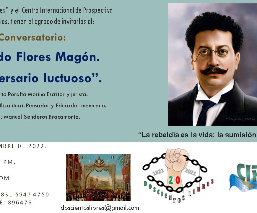 Doscientos Libres y CIPAE lo invitan a su sesión virtual por Zoom: *CONVERSATORIO RICARDO FLORES MAGÓN. C ANIVERSARIO LUCTUOSO.* Jueves, 24 de Noviembre, 2022 06:00 PM Hora de Puebla, México Join Zoom Meetinghttps://us02web.zoom.us/j/83159474750?pwd=RjlQekxvUmdabEN4VVJpY2N0UHFJZz09 Meeting ID: 831 5947 4750Passcode: 896479 Continúa leyendo Legado de Ricardo Flores Magón