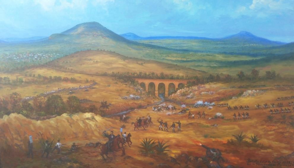 En la imagen que se muestra, está recreada la Batalla de Puruarán. Tras el fracasado intento insurgente de tomar Valladolid (Morelia) en diciembre de 1813, Morelos se replegó a la hacienda de Puruarán. Ahí se encontraría con las tropas de don Ramón Rayón al frente de 700 hombres. Pretendían reordenar las maltrechas fuerzas insurgentes y completar unos 3 mil hombres y 23 cañones, para esperar y confrontar a los Realistas.