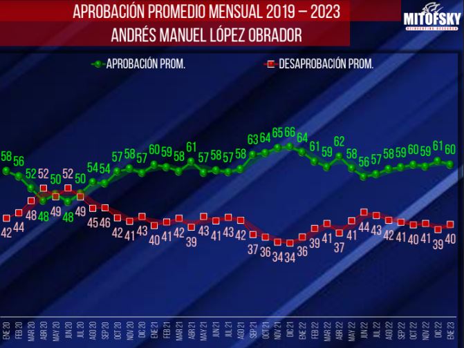 Bajó de 84% en enero 2022, a 62% en enero 2023. Amlo, 10 puntos arriba de Mara. Son 22 puntos menos, que lo colocó del lugar número dos al 14 de aceptación, en Quintana Roo.