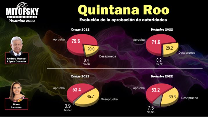 En cuatro evaluaciones mensuales que lleva su gobierno, Mara Lezama Espinosa comenzó con una aceptación en octubre de 53.4% y en enero 2023 bajó a 51.8%; pero en contrario, disminuyó la desaprobación en su contra, con la que llegó, al pasar de 45.7 a 39.3%, según Mitofsky.