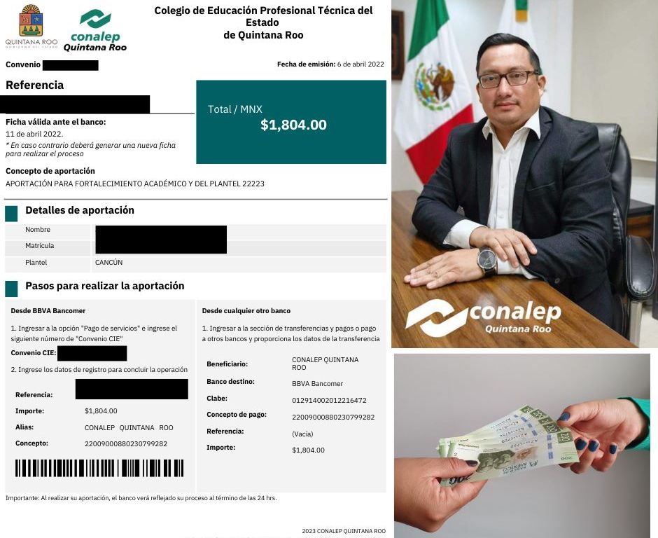 El Conalep a cargo de Aníbal Montalvo Pérez se inventó el concepto de “aportación para fortalecimiento académico y del plantel” para el cuarto y sexto semestre que va de los 800 pesos en Chetumal, 700 pesos en Felipe Carrillo Puerto, 902 pesos en Playa del Carmen, mientras que en Cozumel es de mil 325 y los cuatro planteles de Cancún en mil 804 pesos.