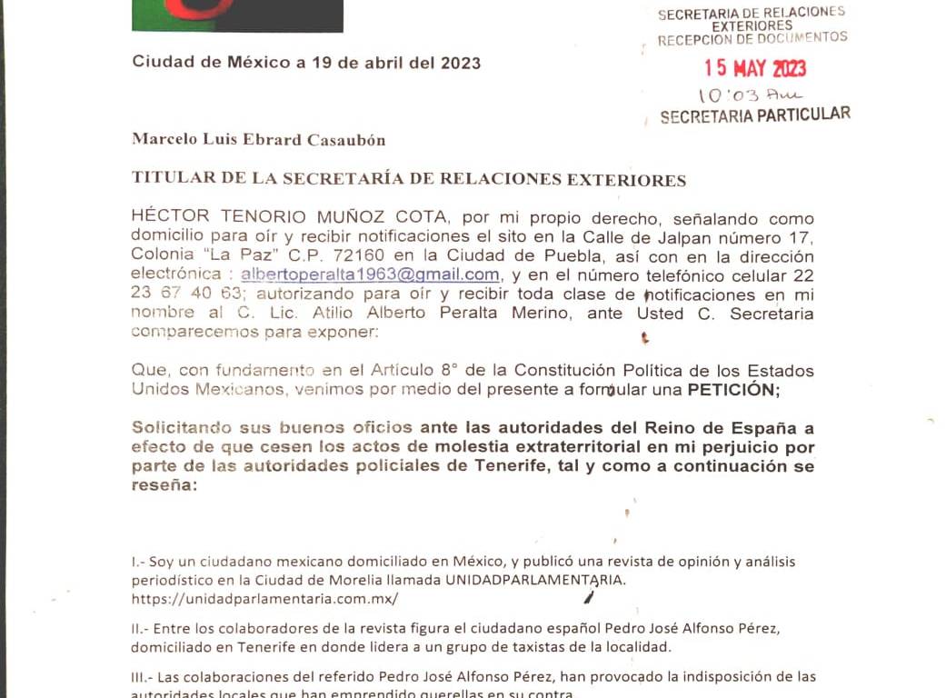 Hago referencia a su carta fechada el 19 de abril del presente, dirigida al Secretario de Relaciones Exteriores, Marcelo Ebrard Casaubon, recibida en esta Dirección General el pasado 16 de mayo, mediante la cual expone su caso y por lo que solicita intervención ante las autoridades de España.