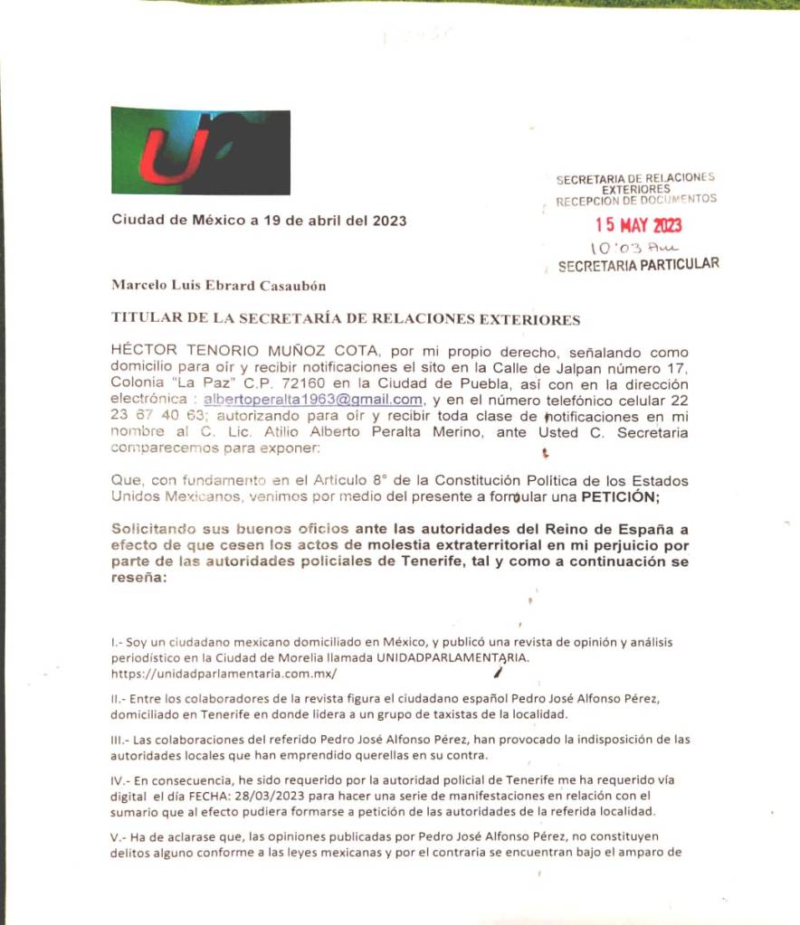 Carta de Unidad Parlamentaria dirigida a dirigida al Secretario de Relaciones Exteriores, Marcelo Ebrard Casaubon.