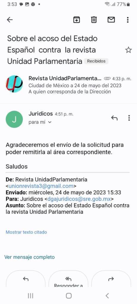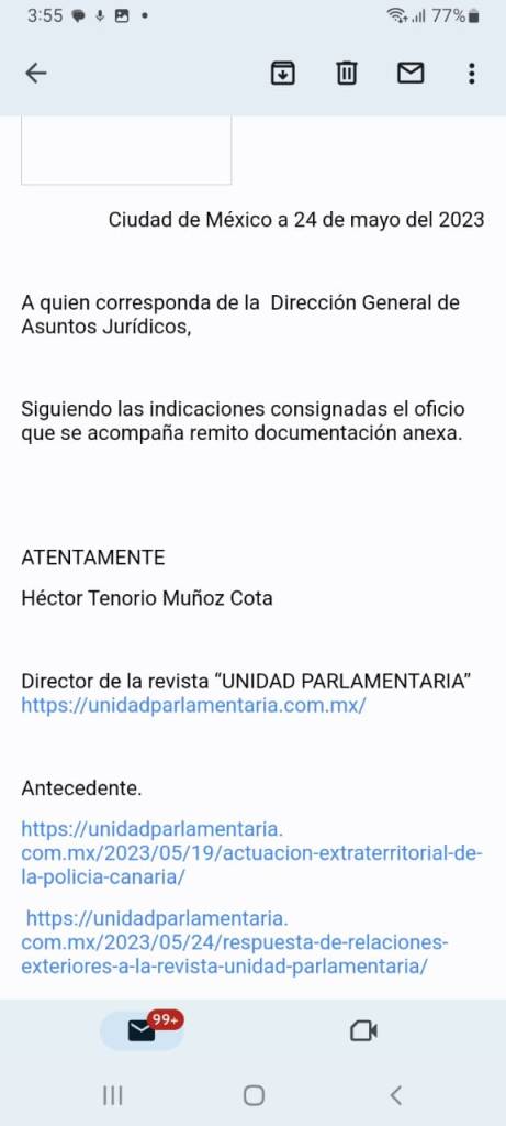 La Secretaria de Relaciones Exteriores contesto a la Revista Unidad Parlamentaria, en estos términos.