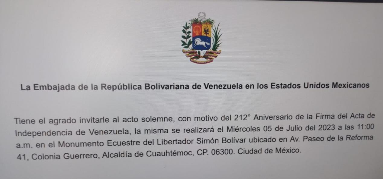 Al haber sido invitado a la ceremonia, que al efecto habrá de celebrar la misión diplomática de la República Bolivariana de Venezuela acreditada en nuestro país, presidida por el excelentísimo embajador Comandante Francisco Arias Cárdenas con motivo del 212 aniversario de la firma del Acta de Independencia de su Independencia, he sido objeto de una honrosa distinción. Había sido invitado con antelación, el 17 de diciembre del 2021 a pronunciar un discurso con motivo de la conmemoración del aniversario luctuoso de Simón Bolívar.