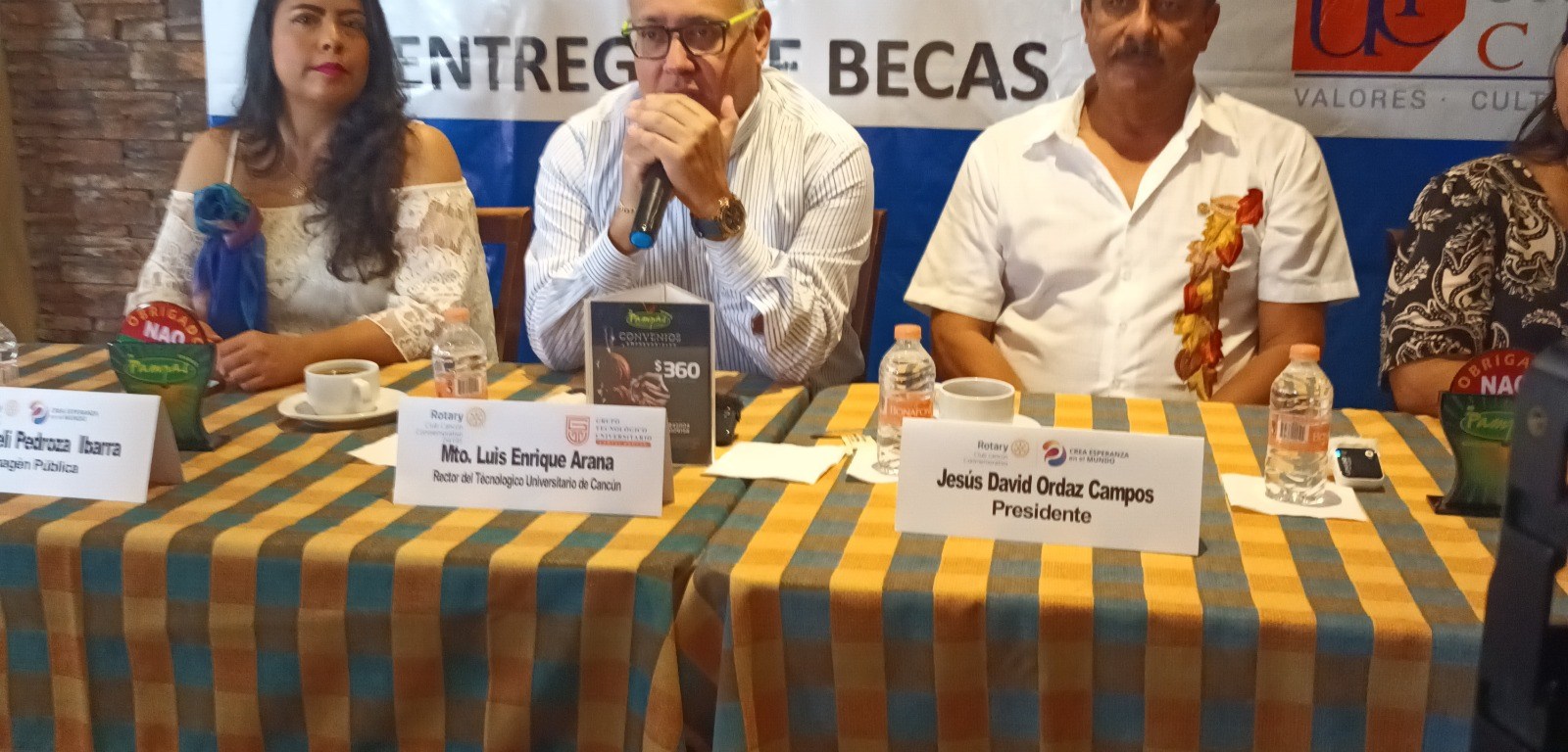 El presidente del Rotary Club Cancún Conmemorativo Jesús David Ordaz Campos informó cómo se van a entregar 200 becas para personas con estudios sin concluir por falta de recursos económicos, estímulos donados por el Tecnológico Universitario Cancún cuyo rector es Luis Enrique Arana Ortega.