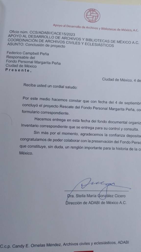 Después de más de tres años, Archivos y Bibliotecas de México, ADABI Fundación Harp Helú hizo entrega formal del Fondo Margarita Peña a la Biblioteca Nacional de su Alma Mater, la UNAM.