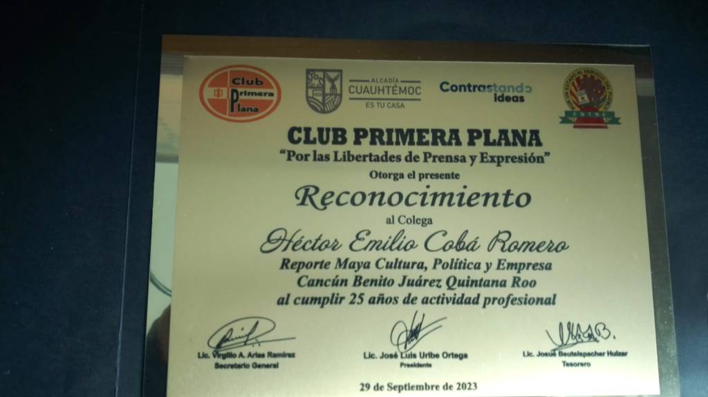 El Club Primera Plana también se honra al honrar a Héctor Cobá Romero, –en ceremonia en la sede de la Sociedad Mexicana de Geografía y Estadística del centro histórico de la Ciudad de México–, por su periodismo militante de la cultura, de la crítica muchas veces ácida y su rigor que siempre busca en los géneros periodísticos.