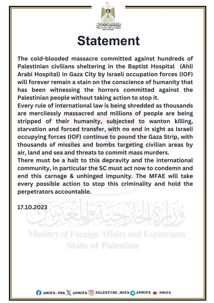 El bombardeo al hospital bautista en Gaza ha impactado al mundo. Enfermos, doctores, enfermeras y refugiados que buscaban salvarse del horror perecieron. Otros quedaron atrapados entre los escombros. La autoridad local (Hamás) dio a conocer la cifra de 500 muertos. El ejercito de Israel intento deslindarse de este genocidio. Las protestas se han presentado en Cisjordania, Turquía, Líbano, Jordania. En la Ciudad de México personas de distintas nacionalidades se ha reunido en la embajada de los Estados Unidos para rezar con dirección a la Meca.