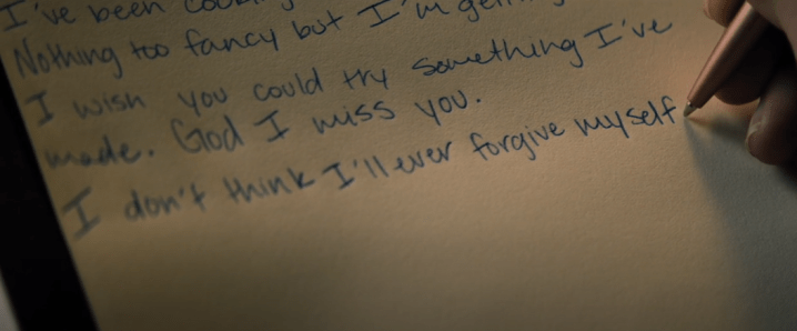 Camina entre escenas de esa tragedia hasta llegar a una mesa donde está la joven Brynn. Esta escena parece guardar la premisa de la cinta, se mira a sí misma a punto de escribir lo que parece su primera carta, todo ocurre sin palabras, la chica está a punto del llanto y de escribirle a su mejor amiga, pero es aquí, solo con la mirada, que se entiende que todo cambió, ella toma la mano de su yo adolescente y le ofrece el perdón que realmente necesitaba, el suyo.