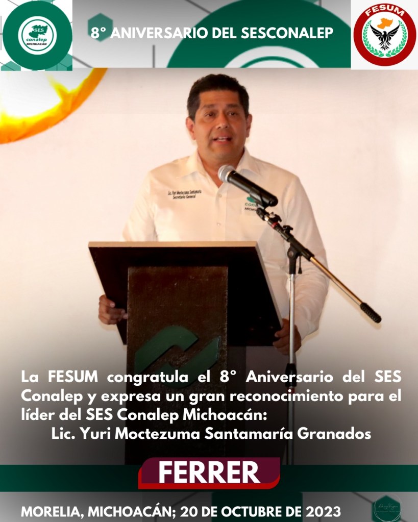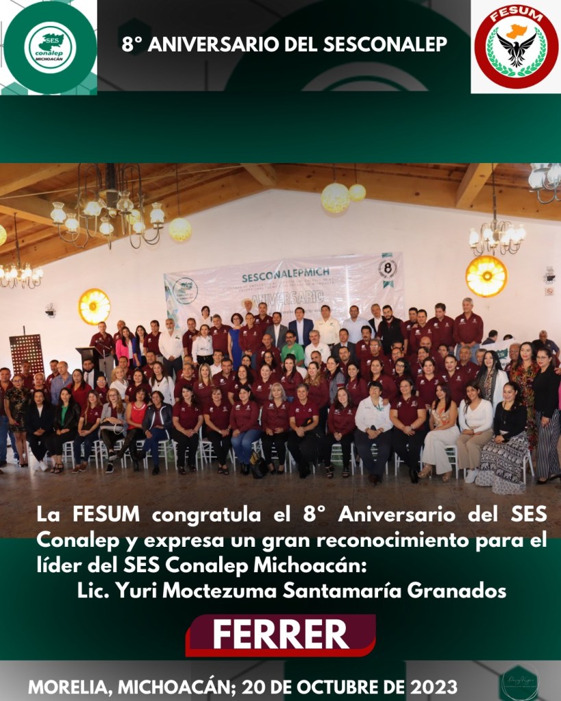 Importantes líderes sindicales pertenecientes al SES Conalep Michoacán, así como integrantes gremiales pertenecientes a la Federación de Sindicatos Unidos por Michoacán (FESUM) celebraron el 8º Aniversario del SES Conalep, sindicato liderado por el licenciado Yuri Moctezuma Santamaría Granados.