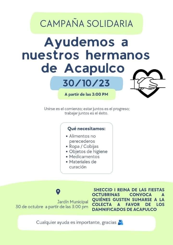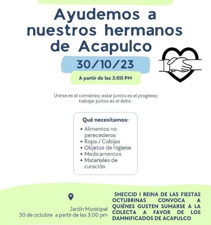 El el 30 de octubre, en el jardín municipal de Apatzingán estarán ciudadanos a partir de las 3:00 pm recolectando alimentos no perecederos, ropa,cobijas, medicamentos, objetos de higiene, para enviarlos a nuestros hermanos de Acapulco. Hoy por ellos mañana por nosotros.