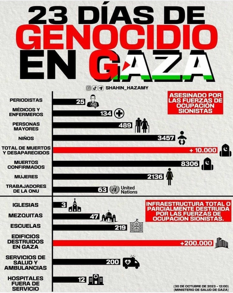 Ante una nueva fase de guerra de exterminio con la invasión a la franja de Gaza, el sitio, el corte de Internet, telefonía, agua, electricidad y la fuerte represión en Cisjordania, sostenemos nuestra posición a favor de la paz y por la liberación de Orión Hernández Radoux e Ileana Gritzewsky, mexicanos secuestrados por Hamas desde el 7 de octubre. Exigimos al gobierno israelí de Benjamín Netanyahu que cese las hostilidades. Los bombardeos contra hospitales, iglesias, campos de refugiados y escuelas configuran bárbaros crímenes de guerra que violan el derecho internacional y la Convención de Ginebra de 1949 sobre la protección de civiles. Denunciamos la vergonzante postura belicista de Estados Unidos, Alemania, Reino Unido y Francia, que bloquean la paz en el Consejo de Seguridad de la ONU. Exigimos a la embajadora israelí, Einat Kranz Neiger, que demande a su gobierno cesar la guerra para el establecimiento de corredores humanitarios y la presentación con vida de los cautivos. Exigimos al gobierno del presidente López Obrador que sostenga una postura más contundente frente a Israel para detener el genocidio.