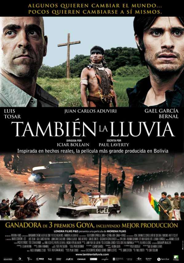 La cinta “También la Lluvia” de la realizadora Iciar Bollain, filmada en escenarios naturales en el año 2010, relata la sublevación popular protagonizada por los habitantes de Cochabamba, Bolivia, entre los meses de enero y abril del año 2000, conocida popularmente como “La Guerra del Agua”.