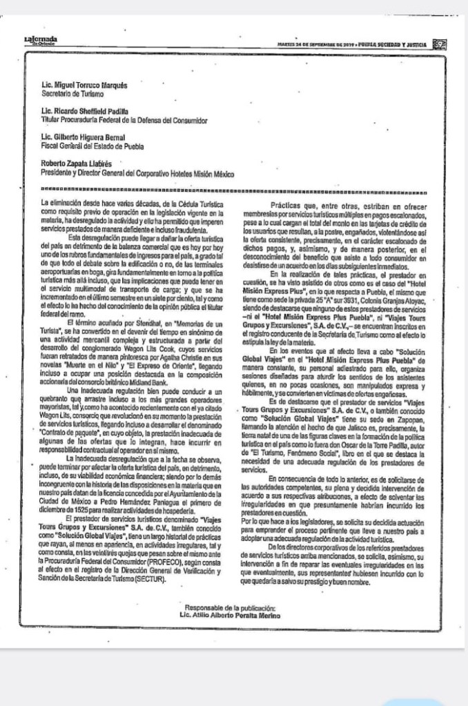Consecuencia, de ello, el 24 de septiembre de 2019 se publicó un desplegado en el diario “La Jornada de Oriente”, que resultaría del todo premonitorio ya que en el mismo se hacía alusión al consorcio decano de la actividad en el mundo: “Wagon List Cook”, cuyo quebranto financiero, a escala mundial, fue anunciado en todas las primeras planas del orbe precisamente ese mismo día.