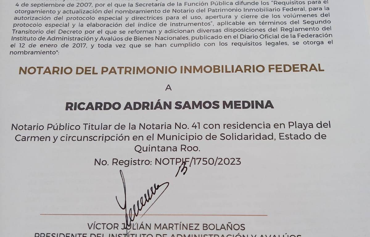 Este 4 de diciembre, el presidente del Instituto de Administración y Avalúos de Bienes Nacionales Víctor Julián Martínez Bolaños, le entregó en la Ciudad de México, el nombramiento con número de registro NOTPIF/1750/2023, al abogado quintanarroense.