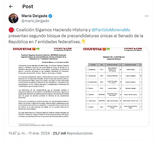 A media noche, el dirigente nacional del Movimiento de Regeneración Nacional (Morena) Mario Delgado Carrillo, por medio de su red social informó que en Quintana Roo los candidatos al Senado de la República son, en primera fórmula Anahí González Hernández, en segunda fórmula Eugenio Segura Vázquez. De acuerdo al listado posteado por Mario Carrillo, Anahí González va representando la acción afirmativa indígena, y por el tipo “Sigamos Haciendo Historia”, o sea por la coalición de los partidos Morena-Verde Ecologista-del Trabajo. Las definiciones fueron porque estas fórmulas son “altamente competitivas”.