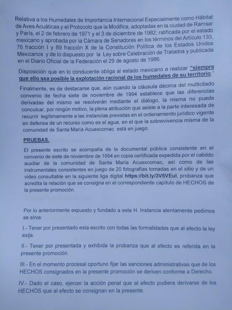 Denuncia presentada en representación de la comunidad y de diversos interesados por Atilio Alberto Peralta Merino y Manuel Senderos Bracamonte conforme a lo dispuesto tanto en el Artículo 124 bis de la Ley de Aguas Nacionales, como en los diversos 190 a 204 en lo conducente de la Ley General d Equilibrio y Protección al Ambiente, como en el numeral 1 del Artículo 3° de la Convención, Relativa a los Humedales de Importancia Internacional Especialmente como Hábitat de Aves Acuáticas ( Convención de Therán) publicada en el Diario Oficial de la Federación el 29 de agosto de 1986; disposición que en lo conducente obliga al estado mexicano a realizar “siempre que ello sea posible la explotación racional de los humedales de su territorio.”