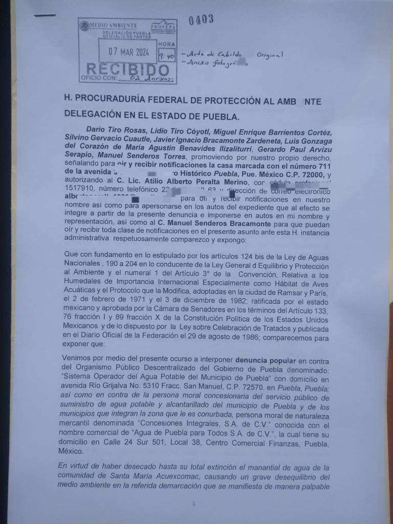 El jueves 7 de marzo a las 10 a.m. se presentará denuncia popular ante la delegación de PROFEPA en Puebla ubicada en la esquina de la 5 poniente y 13 sur, por la desecación del manantial de Acuexcomac por parte de SOAPAP y la afectación a el ahuhuete de 1200 años de antigüedad.