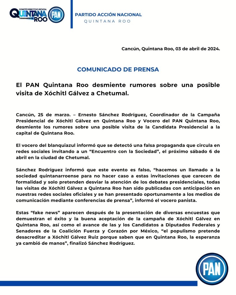 También se informó que este evento es falso, “hacemos un llamado a la sociedad quintanarroense para no hacer caso a estas invitaciones que carecen de formalidad y sólo pretenden desviar la atención de los debates presidenciales, todas las visitas de Xóchitl Gálvez a Quintana Roo han sido publicadas con anticipación en nuestras redes sociales oficiales y se han presentado oportunamente a los medios de comunicación mediante conferencias de prensa”.